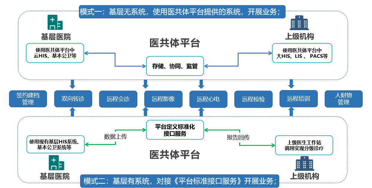 县域内紧密型医共体平台应用场景可以根据医共体成员单位实际信息化系统现状选择模式: